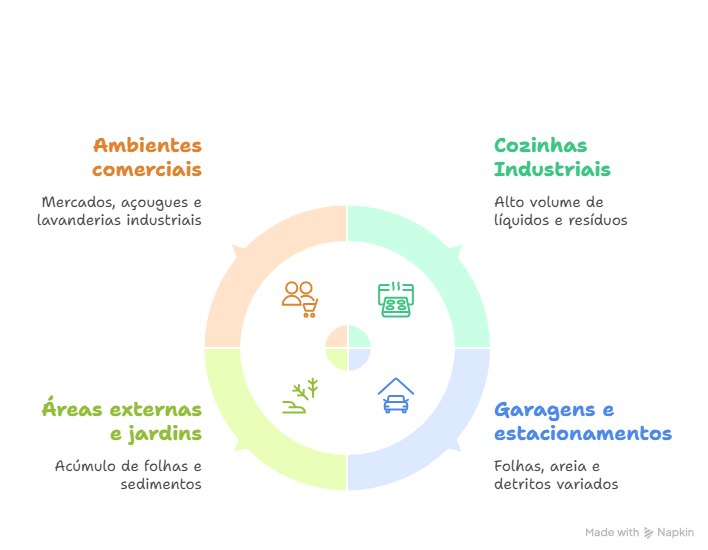 Para sistemas mais exigentes, como cozinhas industriais, é importante contar com orientação técnica para determinar o número de pontos de drenagem e a vazão necessária para cada local.